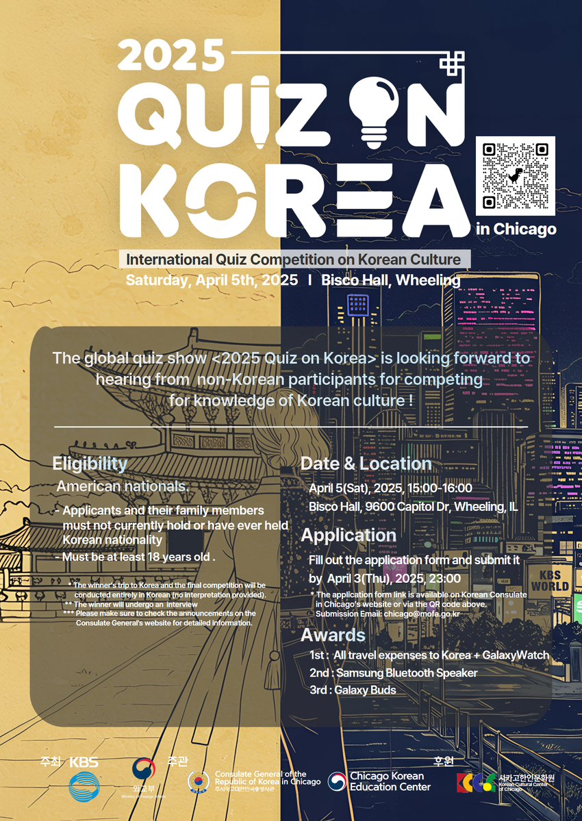 The Consulate General of the Republic of Korea in Chicago is pleased to announce the 2025 Quiz on Korea Chicago. This is the first time the regional preliminary will be held in the Midwest, and we warmly invite Americans with a strong interest in Korea and Korean culture to participate.
